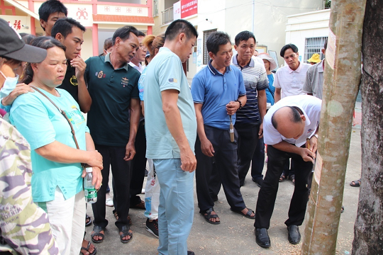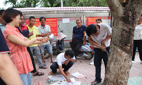 为了检验胶农一天来的割胶技术成绩和收获, 当天下午, 还对胶农中线、低线和阴线割胶技术进行实操测试。