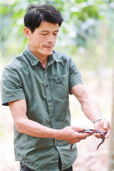 6月9日,万宁市北大镇东兴居打磉队,翻开胶林下厚厚的土壤,一条条粗壮的蚯蚓在湿润泥土中蠕动。比起本地蚯蚓,它们的个头大了许多,有成人手指一般粗,身长有20余厘米。